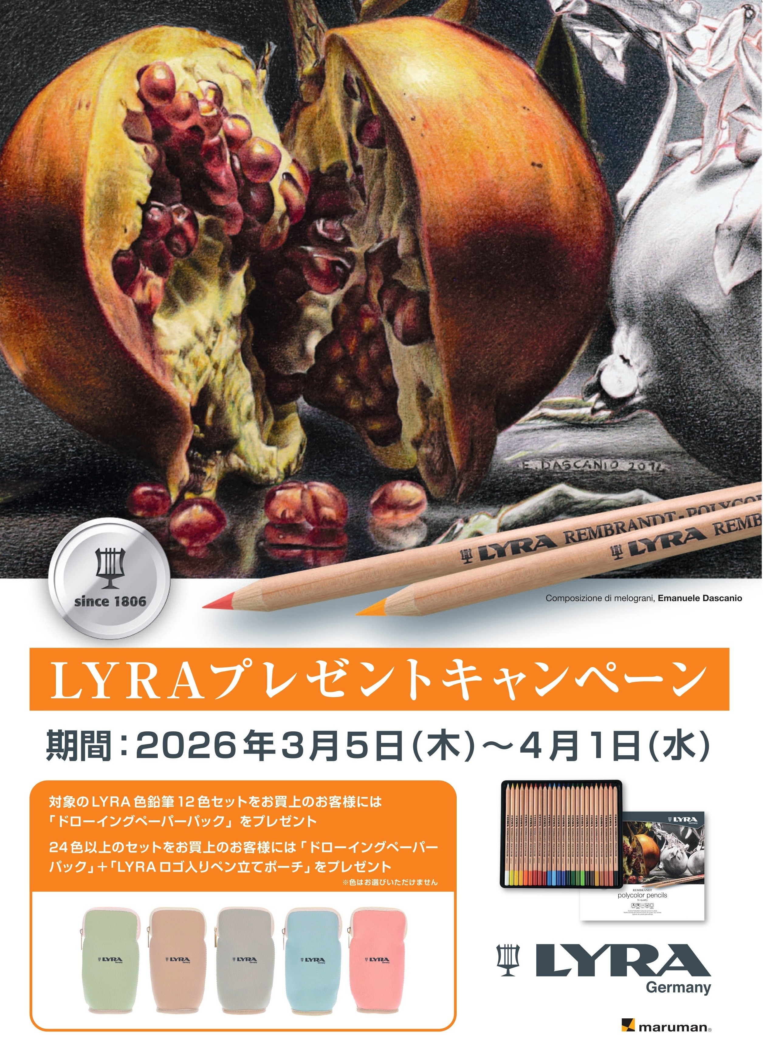 24色以上のセットをご購入されたお客様には、さらにLYRAロゴ入りペンスタンドポーチを差し上げます。